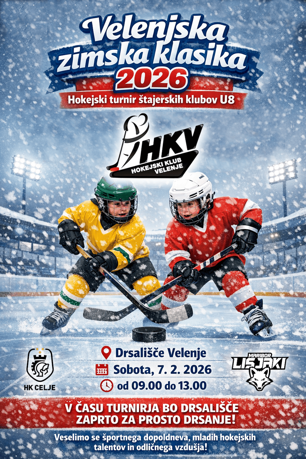 HKV hokejski turnir (7. 2. 2026) HKV hokejski turnir (7. 2. 2026) 1. 2. 2026 hokej Vabljeni na velenjsko zimsko klasiko 2026 – Hokejski turnir štajerskih klubov U8, ki bo v soboto, 7. 2. 2026, od 9. ure dalje na Drsališču Velenje. V času turnirja bo drsališče zaprto za prosto drsanje! Vabljeni! 1. 2. 2026 Categories:novice 7 Likes