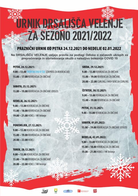 Od petka, 24. 12. 2021 do nedelje, 2. 1. 2022 velja praznični urnik Drsališča Velenje.