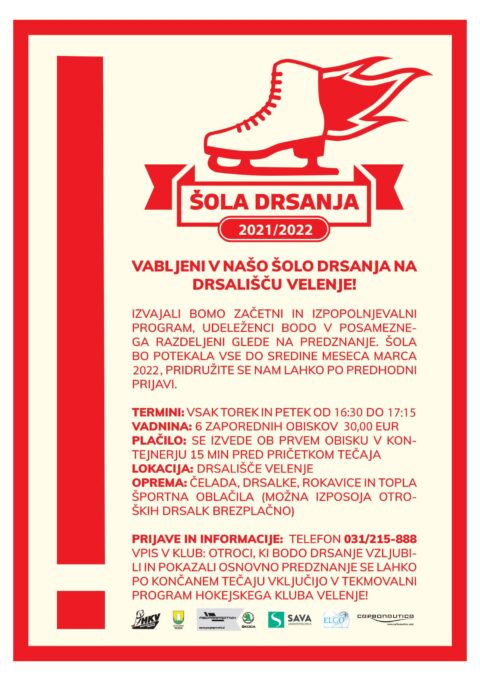 Vabimo na začetni in izpopolni tečaj drsanja. Dodatne informacije in prijave na 031 215 888.